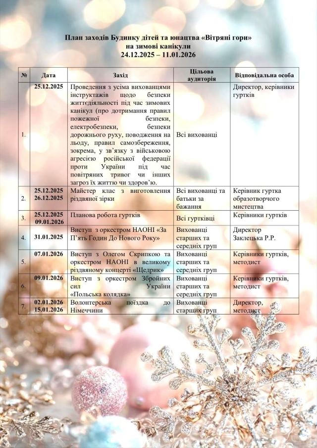 Щоб цей час був цікавим, пізнавальним і творчим, позашкільні навчальні заклади «Будинок дитячої творчості» та Будинок дітей та юнацтва «Вітряні гори» підготували план роботи на період зимових канікул. На дітей чекають творчі заняття, майстер-класи, тематичні заходи та активне дозвілля в теплій і дружній атмосфері Запрошуємо дітей Подільського району провести канікули цікаво та з користю!